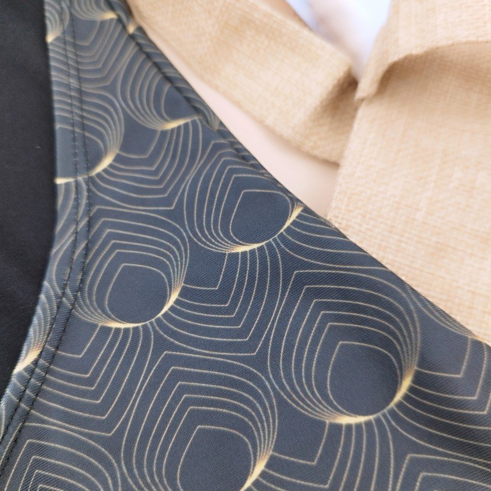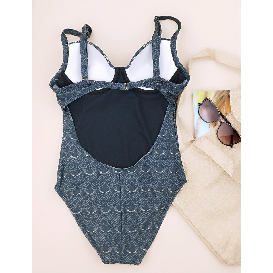 Стилен цял бански с подчертана женственост и модерен арт-деко принт в тъмносиньо със златисти елементи. Моделът е с оформени чашки и банели, които осигуряват стабилна поддръжка и оформят бюста по естествен начин. Презрамките са регулируеми за индивидуално напасване, а гърбът разкрива изрязан елемент със закопчаване, който придава изтънчен завършек. Платът е мек, еластичен и издръжлив – идеален за дълги дни край морето или басейна.
