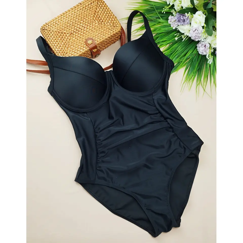 Този елегантен цял бански е създаден с внимание към детайла и нуждите на дамите с по-голям бюст. Вградените банели и оформени чашки осигуряват надеждна поддръжка, комфорт и красиво оформяне на деколтето. Регулируемите презрамки и закопчаването на гърба позволяват индивидуално прилягане и допълнителна стабилност. Банският е леко стягащ, като деликатно оформя талията и подчертава извивките.
