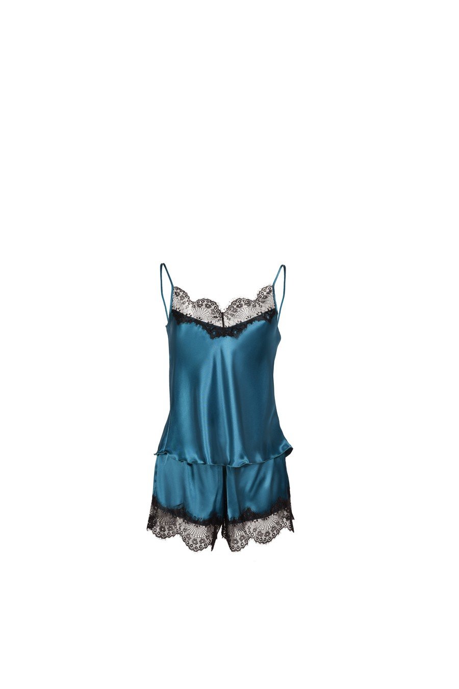 Горната част е с тънки, регулиращи се презрамки и леко свободна кройка, която пада красиво по тялото. Късите панталонки завършват с фина, деликатна дантела по краищата – акцент, който внася нотка изтънченост и женственост, без да натрапва.